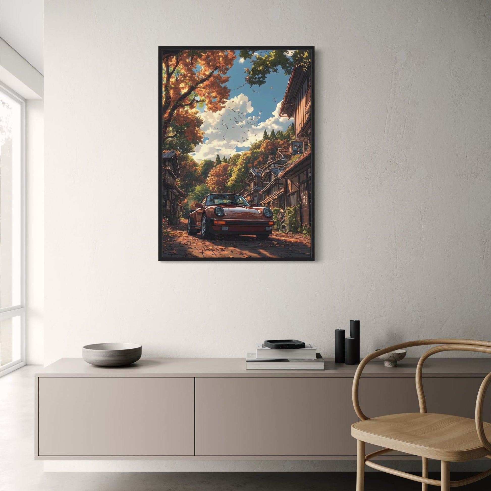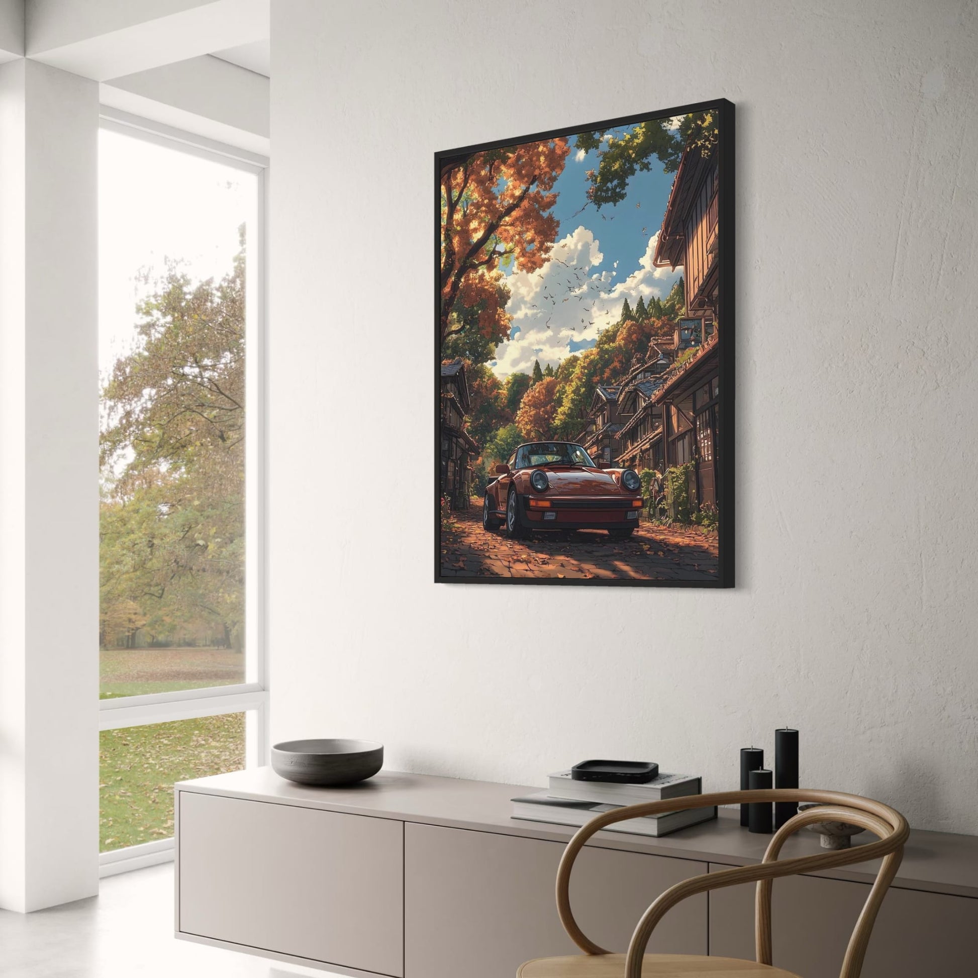 Vintage Red Sports Car | Autumn Village | Japanese Architecture | Maple Trees
