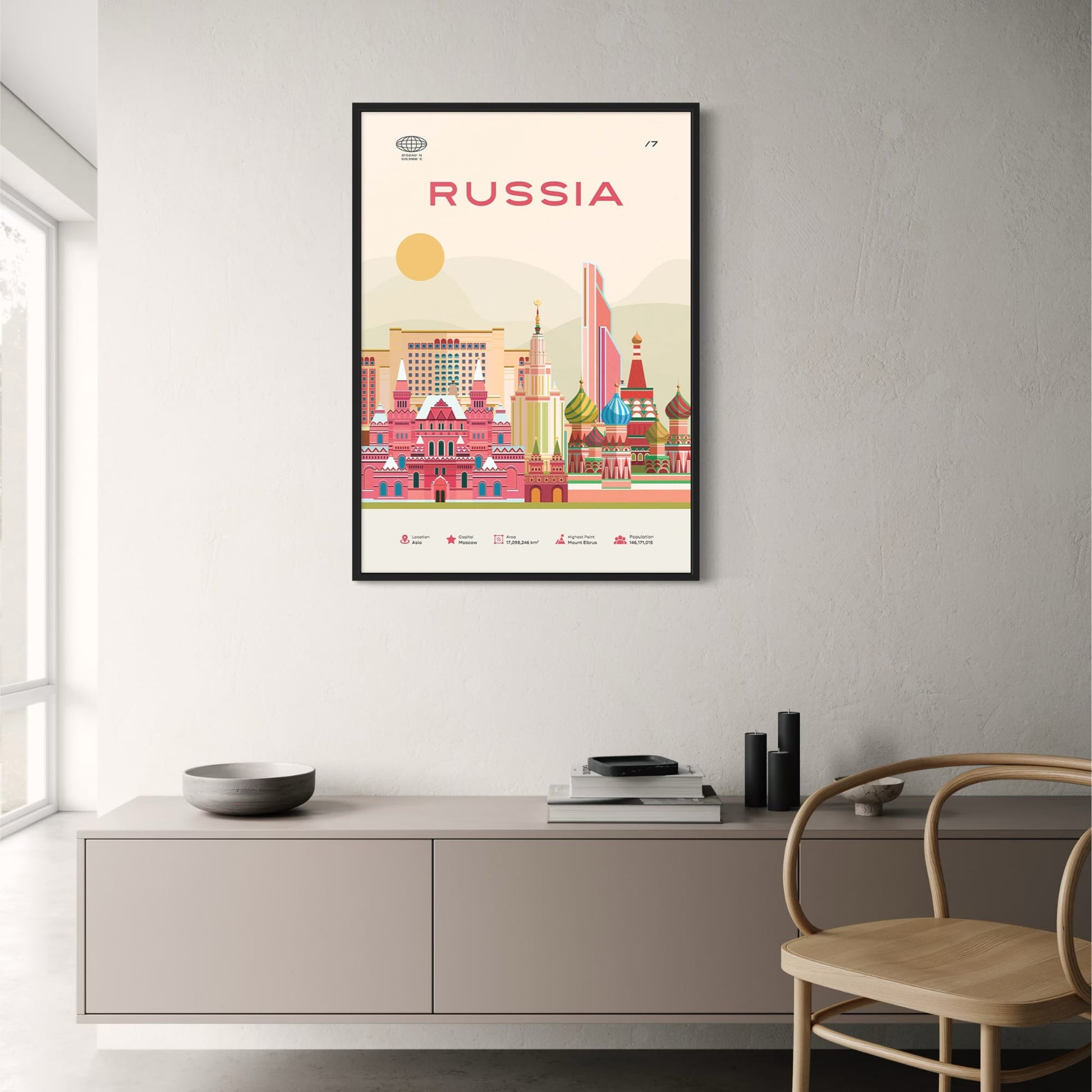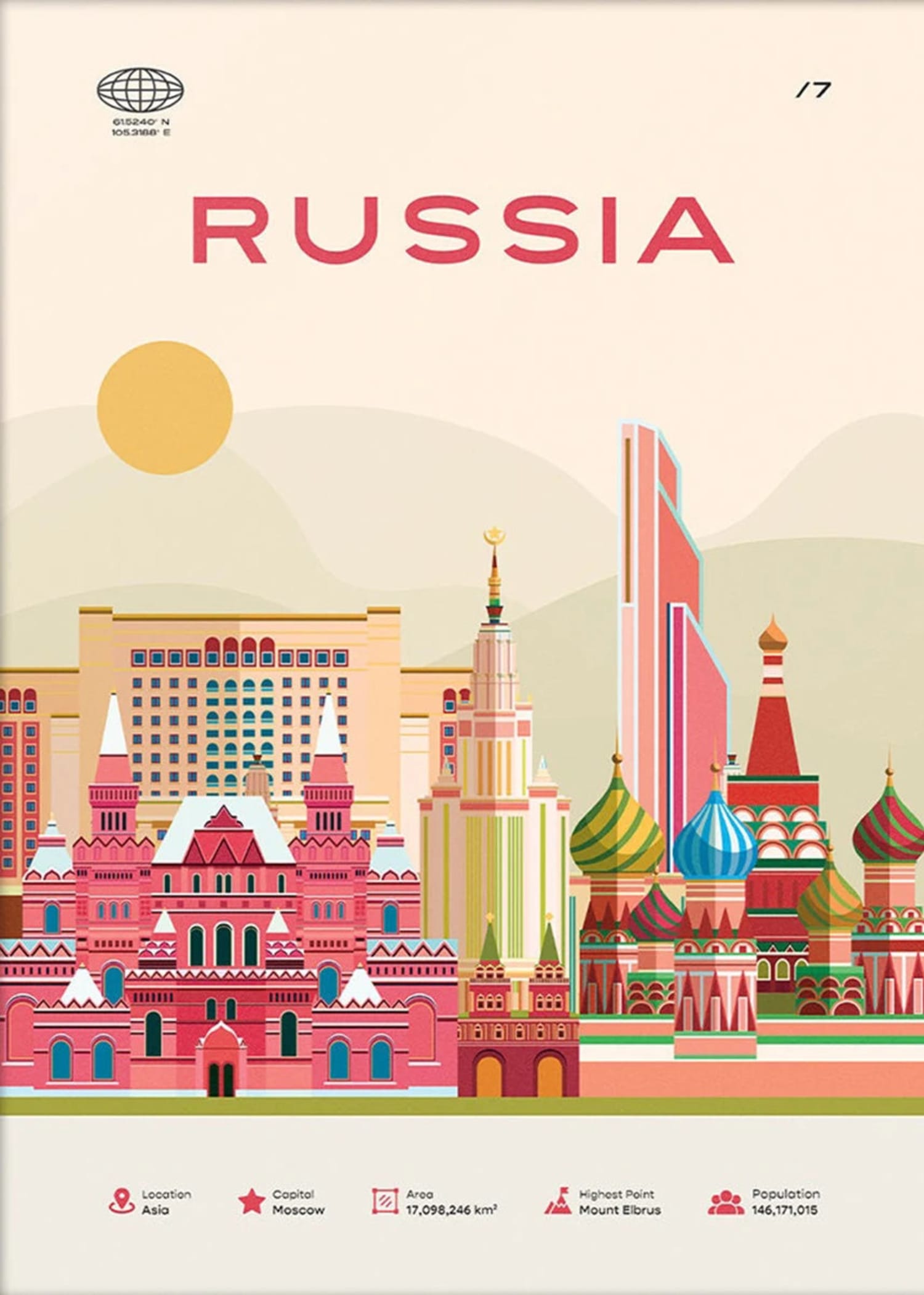 Russia Travel Poster | Moscow Skyline and Landmarks | Red Square and Kremlin Illustration | Unique Wall Art
