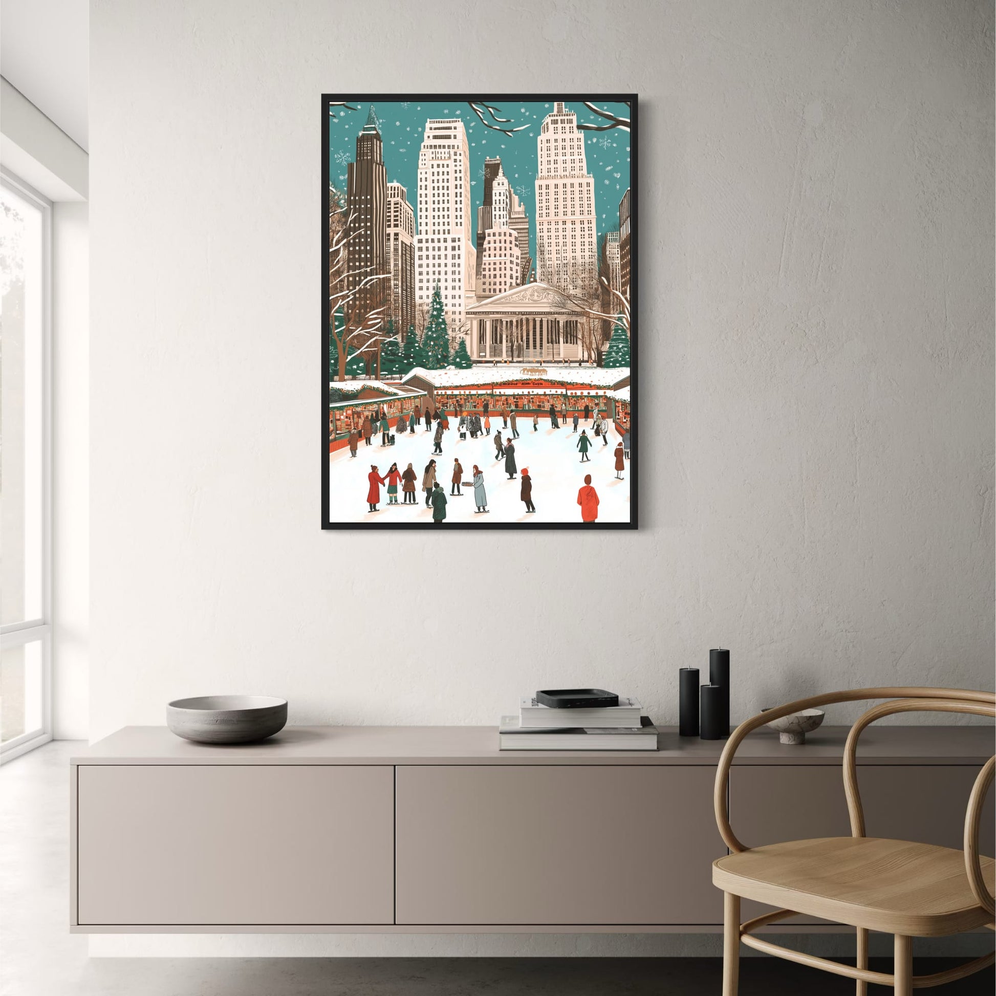 Festive Winter Wonderland | Holiday Skaters & Market | Vibrant Christmas Trees | Snowy Urban Scene | New York City | Poster Print