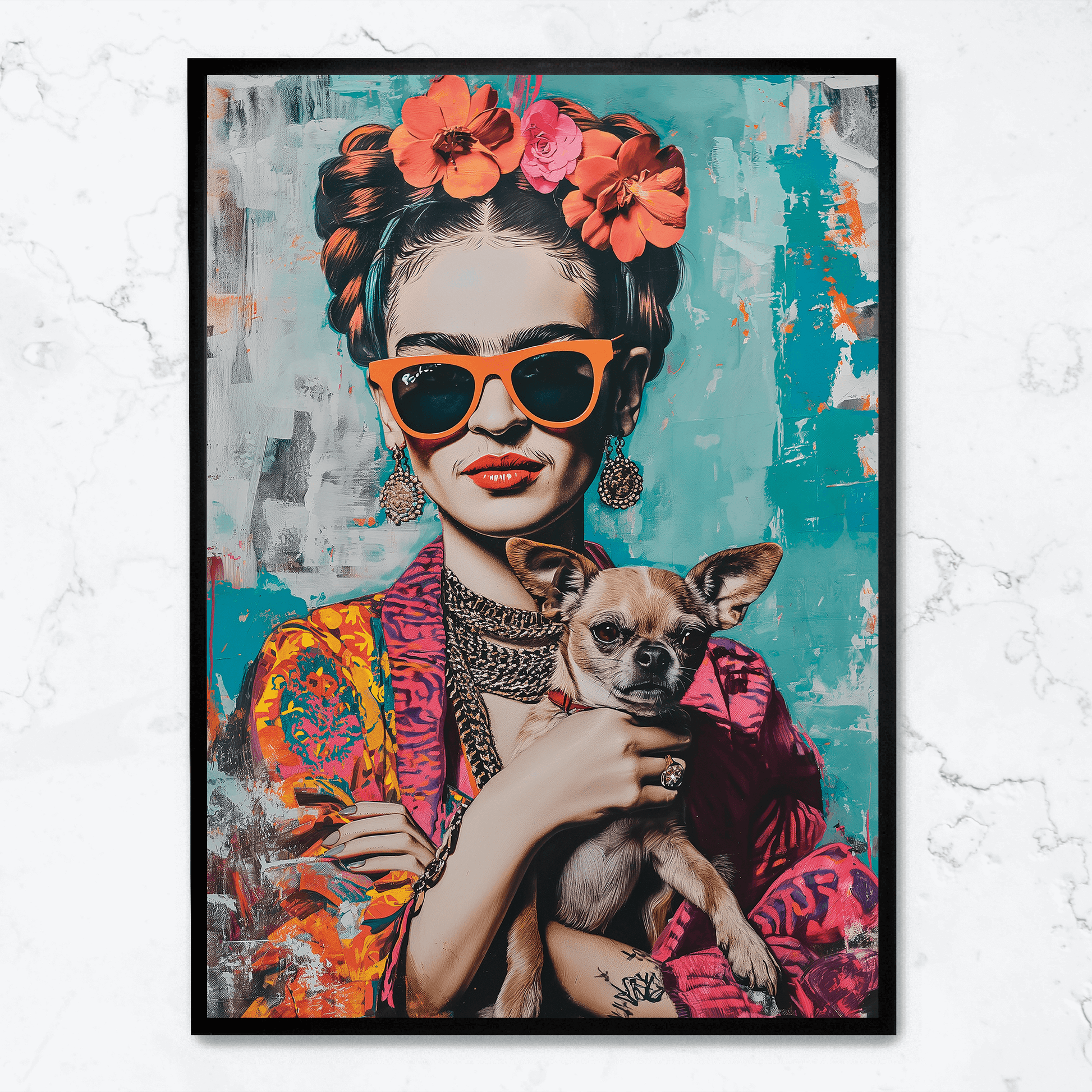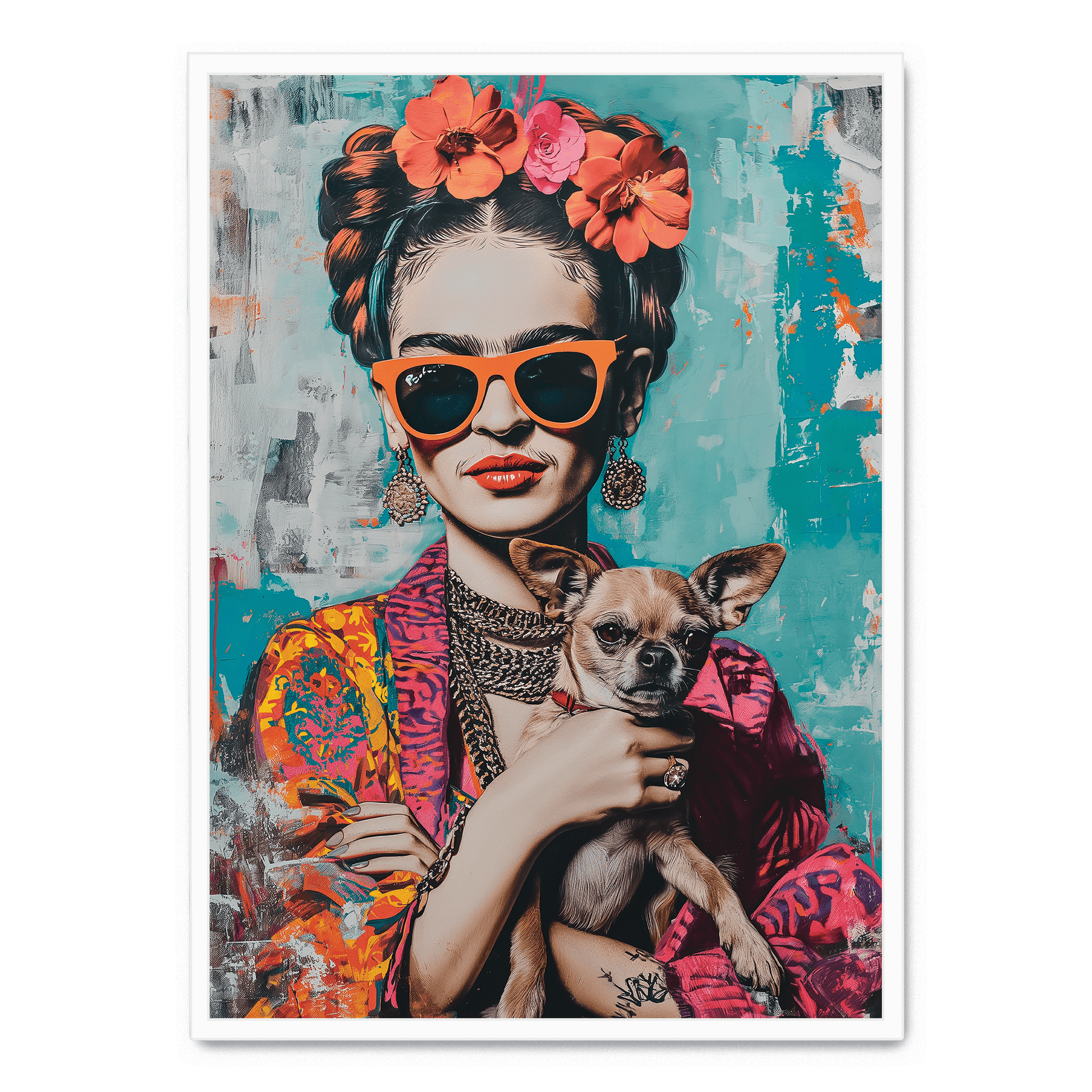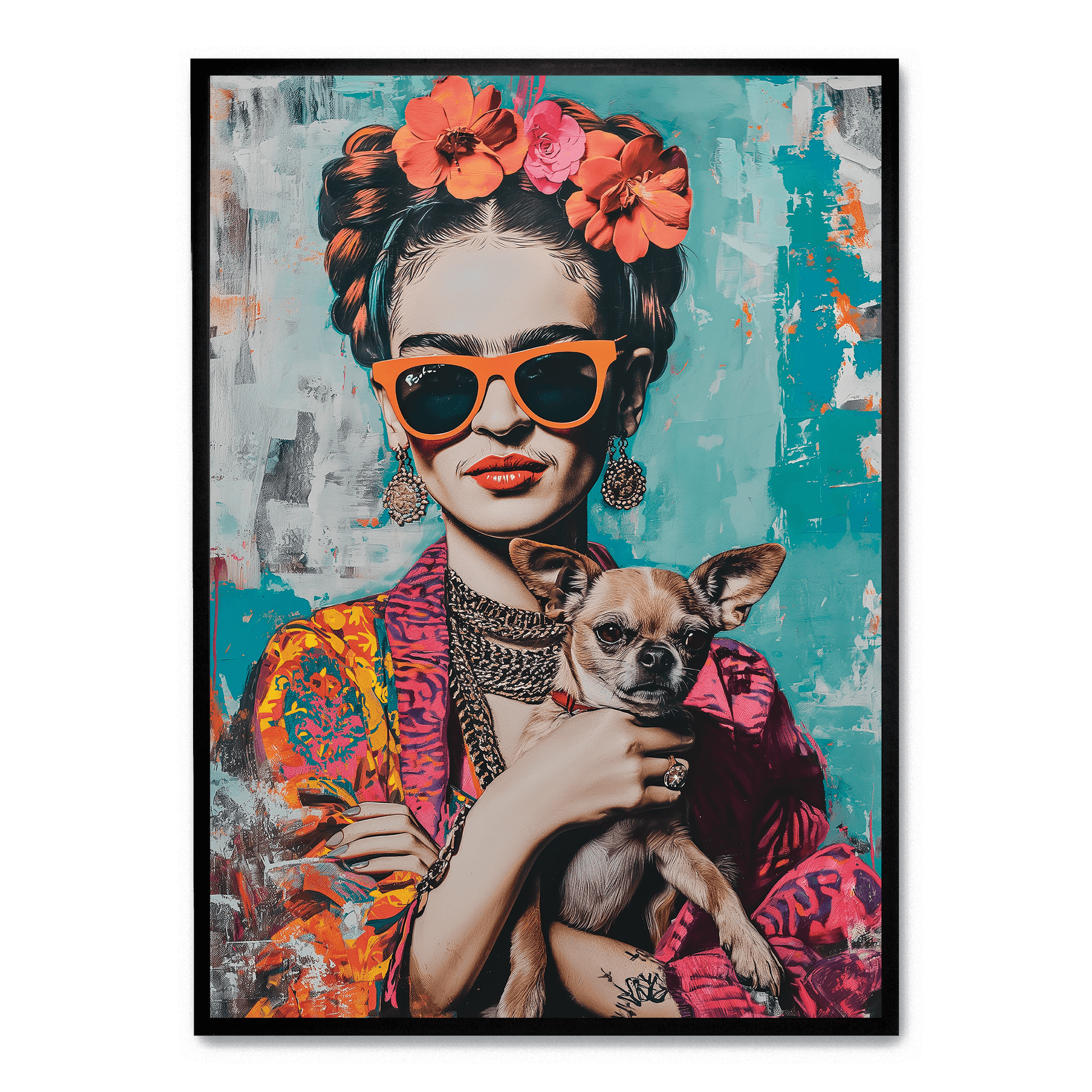 Frida Kahlo Style Poster | Chihuahua Portrait Art | Colorful Wall Decor | Artistic Print for Home & Garden | Unique Dog Themed Artwork