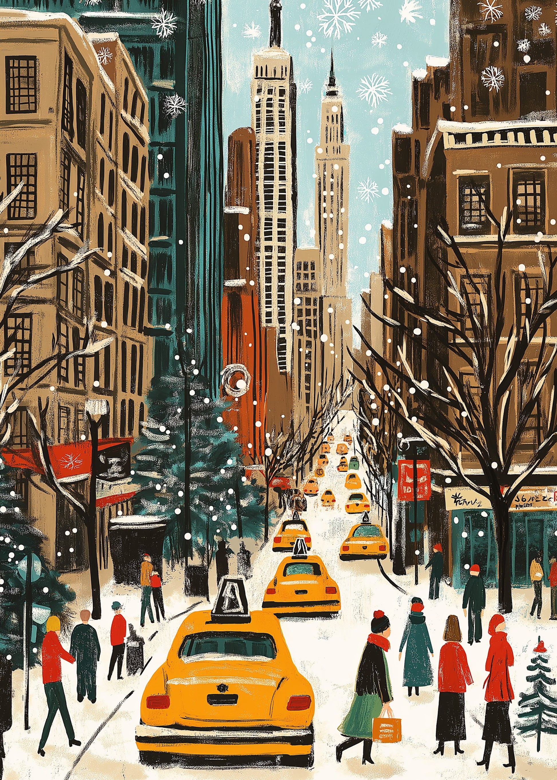Snowy Urban Winter Cityscape Poster | Busy Streets & Yellow Cabs | Vibrant Holiday Scene Art Print | Skyscrapers & Decorated Trees | Charming Seasonal Skyline | Iconic Metropolitan Art Print