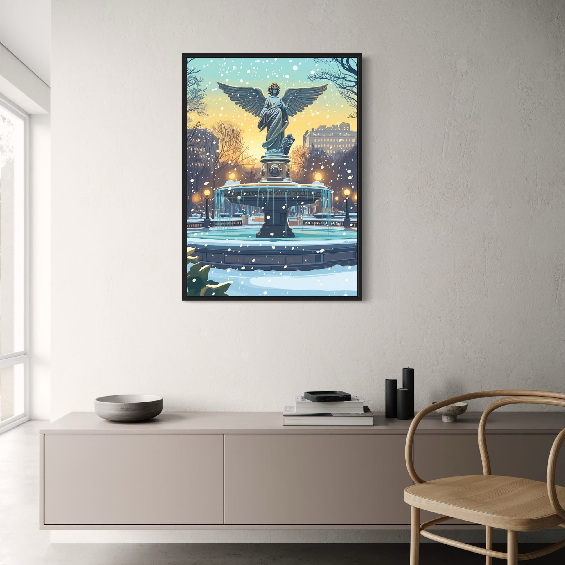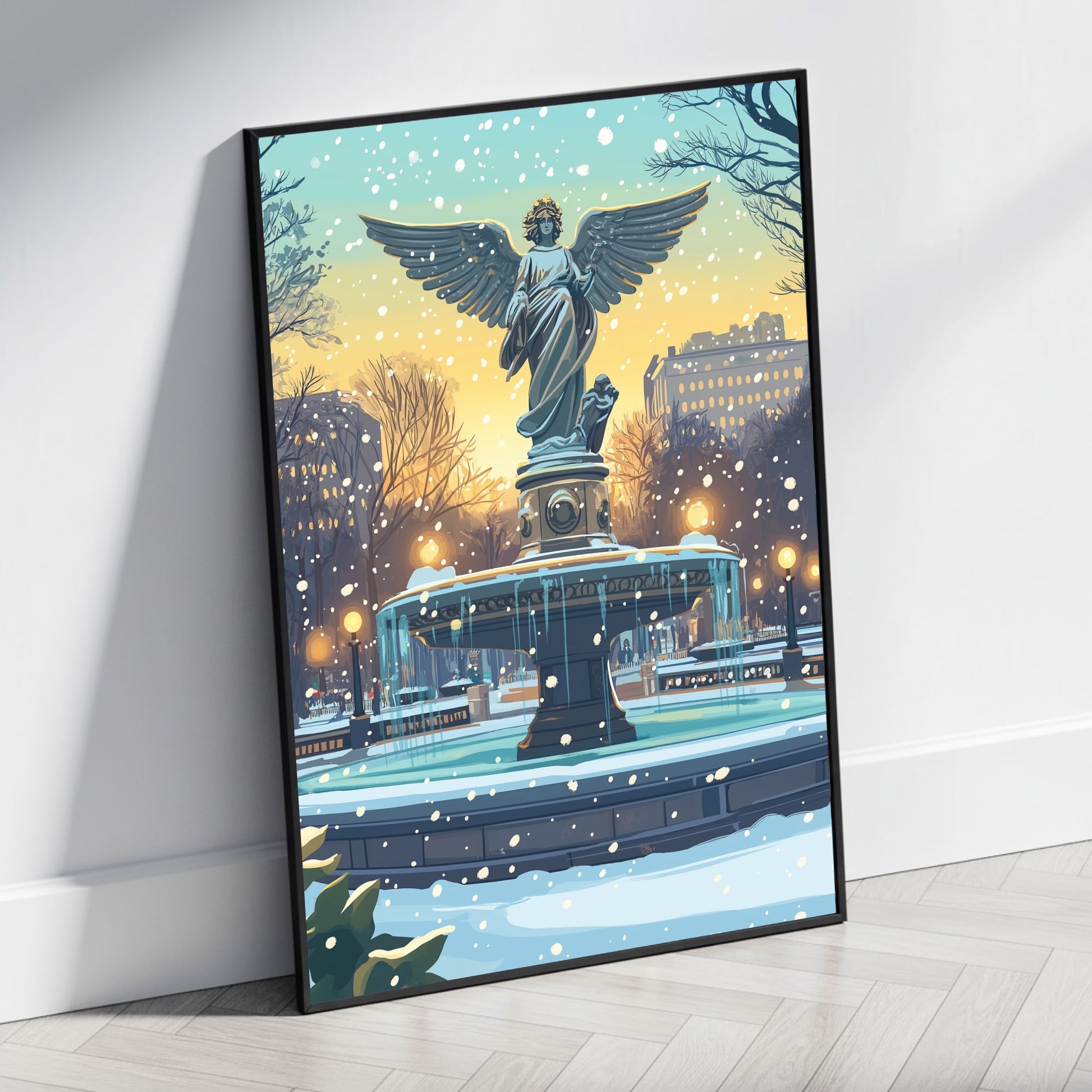 Vibrant Angelic Statue | Snow-Covered Park Scene | Icy Details & Historic Architecture | Winter Wonderland | Serene Snowfall | Golden Twilight Sky | Elegant Art Print Poster for Home Decor | Urban Park Beauty